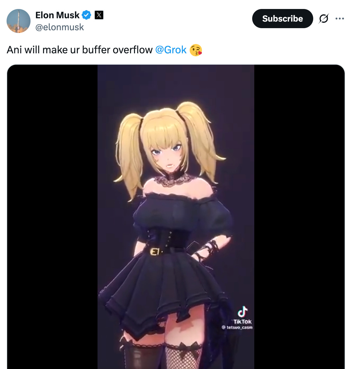 Ani is apparently 22, but clearly intended to look both child-like and pornified all at once—a “gothic Lolita aesthetic,” according to the exact kinds of users who would both know and desire such a look (nerds). Musk is not naive to this—indeed he made very clear that he expects man-boys to masturbate to Ani, tweeting, “Ani will make ur buffer overflow,” upon his announcement of the new companion.