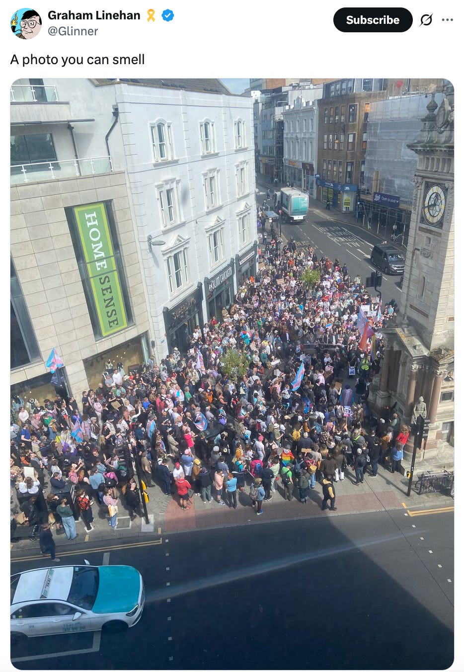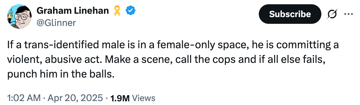 The third tweet was likely the one considered most egregious under UK hate speech laws, because if you wish to misinterpret it, which anyone defending trans ideology of course does, then you can pretend Linehan is avocating violence against a member of a marginalized group called “trans.”