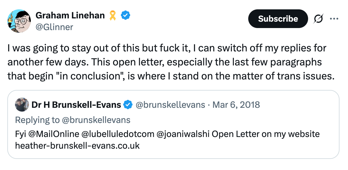 The first time Linehan waded into the trans debate was in March 2018, when he shared an article by Heather Brunskell-Evans describing her persecution for saying that sex is a biological reality and challenging the transitioning of kids. She wrote: