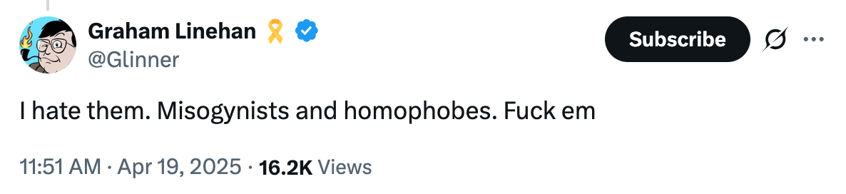 The misinterpretation of this particular tweet is so maddeningly stupid because of course everyone knows—at least the did until ten years ago—that men who go into women-only spaces like bathrooms are creeps and predators. Pretending that Linehan is hateful for stating the most obvious thing is an act of dishonesty, either because you are pretending to be stupid and that you don’t understand his obvious point, or because you are pretending that you actually believe men in makeup and dresses are literally women, which of course you don’t you lying liar.