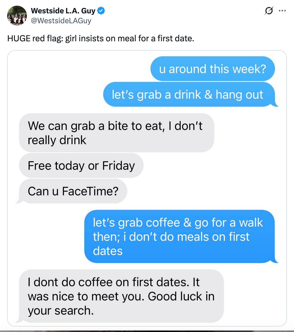 An ever-present trope on the platform we sometimes call X is the one that insists women use dates with men as a means to get free food. The projection is clear to me. That is to say, freeloaders likely presume those around them see the world as they do—they are opportunists so believe others are as well. It is also likely that the men insisting women are all out to milk them dry are also over-avid internet users who have never been on an actual date with an actual woman. “Free food” is something valued by teenage boys—it is not generally a priority to adult woman. Either way, it’s odd and an unattractive quality in a man to see the world as full of people out to take advantage of them. What are they protecting, anyway?