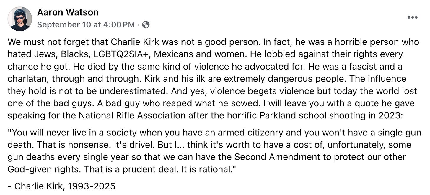 So, to those who have claimed Charlie Kirk got what he deserved (and that isn’t this ever so funny haha!) on account of his support for second amendment rights, and the reality that comes along with these rights, allow me to explain something to you: