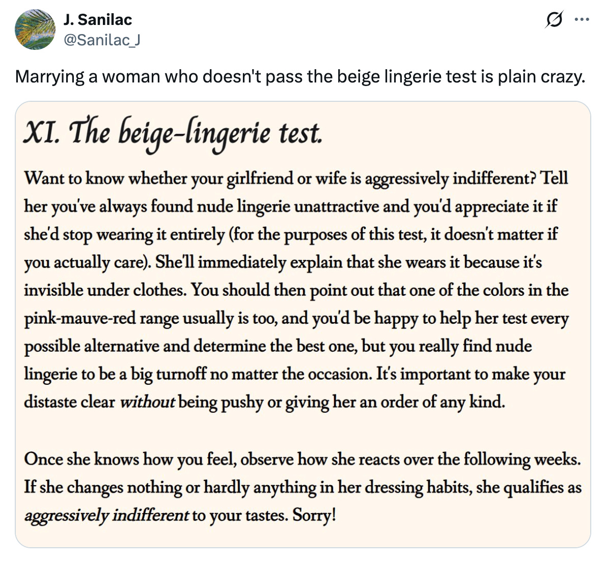 The “test” suggests it will determine whether or not your girlfriend and future potential wife is “aggressively indifferent to your tastes,” based on her willingness to accommodate your legitimate or illegitimate demand that she never wear “beige lingerie” again.